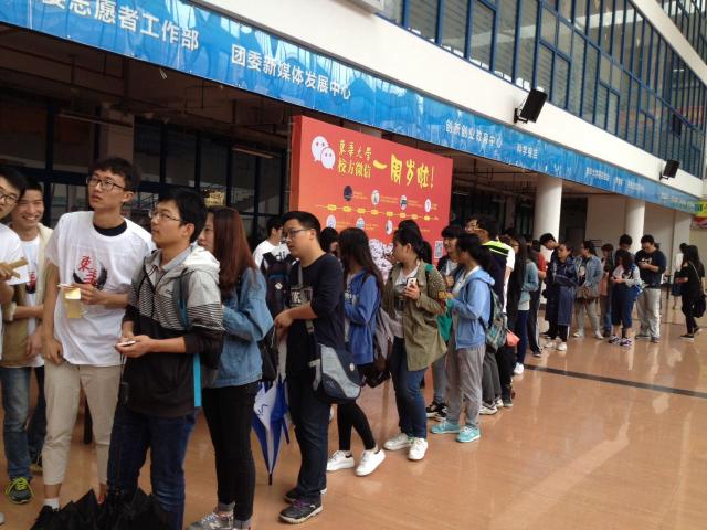 6月3日,校方微信建设团队在松江校区集中开展了周年线下互动推广活动。尽管下起了大雨,但活动仍然得到了师生的热情参与和支持,活动现场,同学们纷纷排起了长队,积极参加微信各类推广互动体验,并在留言空间为东华微信一周年送上自己的祝福。