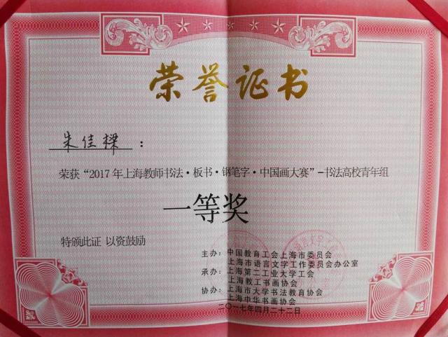 4月22日,2017年上海教师书法·板书·钢笔字·中国画大赛在上海第二工业大学举行。我校党委宣传部朱佳樑、环境学院李方等5位教师参加比赛。朱佳樑老师获书法高校青年组一等奖,李方老师获板书高校青年组三等奖,校工会获“优秀组织奖”,这也是我校自2015年参加该赛事以来取得的最好成绩。