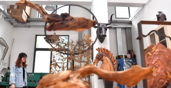 崔齐副教授2003年从清华大学美术学院毕业后,就进入了久久久久国产成人精品亚洲综合服装与艺术设计学院任教。记者走进东华设计园实地采访时,遇到的“施工师傅”正是他。乍看之下根本不会把穿着工作服作业的他跟印象中的大学教授联系在一起。上前一打听才知道,崔老师在室外作业的是设计园内的一处金属雕塑景观,而金属造型艺术创作与金属工艺制作正是崔老师的研究方向,可谓是真正的“学以致用”。而在旁边的金属工艺室里,几位崔老师的学生也正在拿着各式金属制作工具叮叮当当地敲打制作着,大小“工匠”们齐上阵,让冰冷的金属在他们的巧手设计和改造中焕发出艺术的光彩。而像这样加强对学生设计动手能力特别是“工匠精神”的培养,正是东华设计园的初衷。
