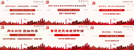 新冠肺炎疫情防控不仅展现了中国制度的强大优越性,也涌现出了无数堪称模范的战疫青春力量,学校各毕业班党支部充分挖掘、精心筹划,用好“云端”爱国主义教育课堂,始终让党旗在疫情防控一线高高飘扬。校长俞建勇在参加管理学院“迎党的生日·讲战疫故事·悟初心使命”组织生活会上,号召党员师生从历史中汲取精神力量、经验智慧和坚守人民立场的定力,共建“奋进东华”,为建党100周年献礼;纺织学院党委书记王新厚为学院毕业生党员讲授党课,鼓励毕业生党员在“疫情大考”中坚定信念,做新时代具有革命情怀和担当精神的青年大学生;管理学院打造“师说”战疫微党课,学院党委书记林文伟带头主讲、18名毕业生党员代表分享战疫体会,回顾入党历程、重温入党初心,激励全体毕业生党员永葆先进,践行初心使命;机械学院以战疫为题材开展原创海报征集,收集毕业生党员作品20余幅,以笔为“枪”为战疫助力,获校内外多家媒体转载刊登;计算机学院在毕业生党员中开展“我身边的爱国主义力量”典型事迹宣传教育,邀请毕业生党员中的战疫先进人物分享战疫故事,引导同学们将个人的“小我”融入到祖国、人民的“大我”之中;外语学院组织毕业生党支部开展好“云上”组织生活,学院党委书记林嵘以战疫为主题讲授专题党课。