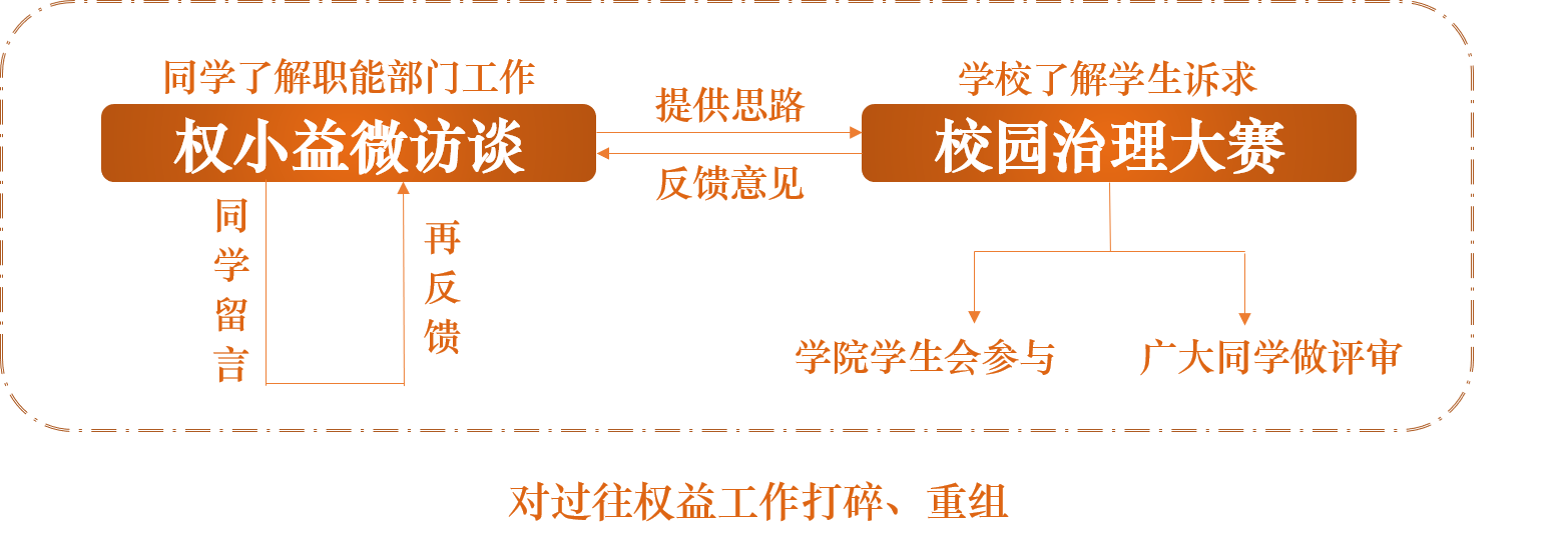 2019年,学生会打好一场“权小益微访谈”+久久久久国产成人精品亚洲综合校园治理大赛的“组合拳”,充分体现了学生会是学校联系广大同学的桥梁和纽带,广大同学通过学生会了解学校职能部处工作,学校领导老师通过学生会了解学生诉求,打破“单行道”、“二极管”式的联络模式。从小切口着眼重视参与并提升校园治理能力,进而围绕学校中心工作来进行提案工作。