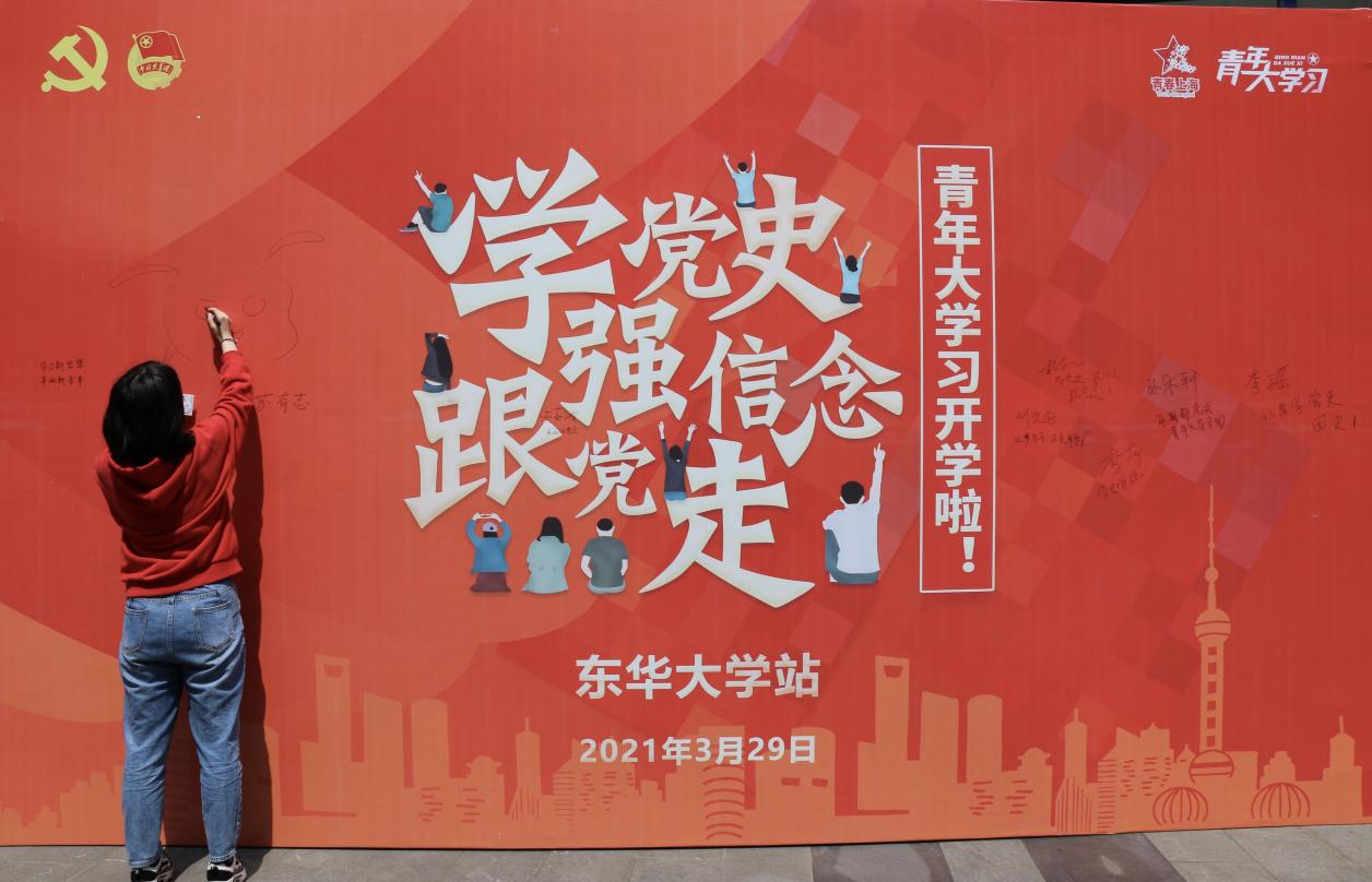我校积极响应“学党史 强信念 跟党走”的号召,以丰富多样的形式拉开了团员青年学党史的序幕。从聆听“农村包围城市 武装夺取政权”这一崭新革命道路背后的故事开始,到参与“唱响百年 申入人心”上海青年学生喜爱的歌曲票选活动,东华青年在现场背景墙上写下爱国爱党的心声,更唱响了激情热血的青春之歌。参与现场活动的胡凯悦说,“以前都是在线上学习,这是第一次和同学一起线下答题‘打卡’。现场答题和学习,让我更有‘实体感’,也加深了我对党史知识的理解。”