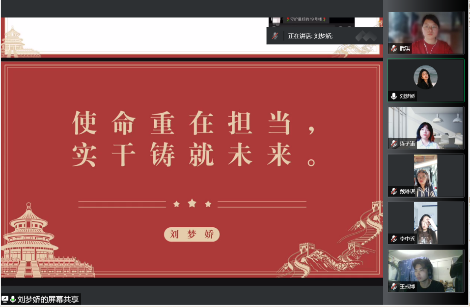 为深入学习贯彻习近平总书记在庆祝中国共产主义青年团成立100周年大会上的重要讲话精神,近日,纺织学院青春领航毕业班学生党支部通过线上会议的形式开展“青春心向党百年再启航”主题党日活动。副校长舒慧生出席活动,学院党委书记李成龙、院长顾伯洪以及党支部全体党员参加活动。活动由党支部书记陈欣园主持。